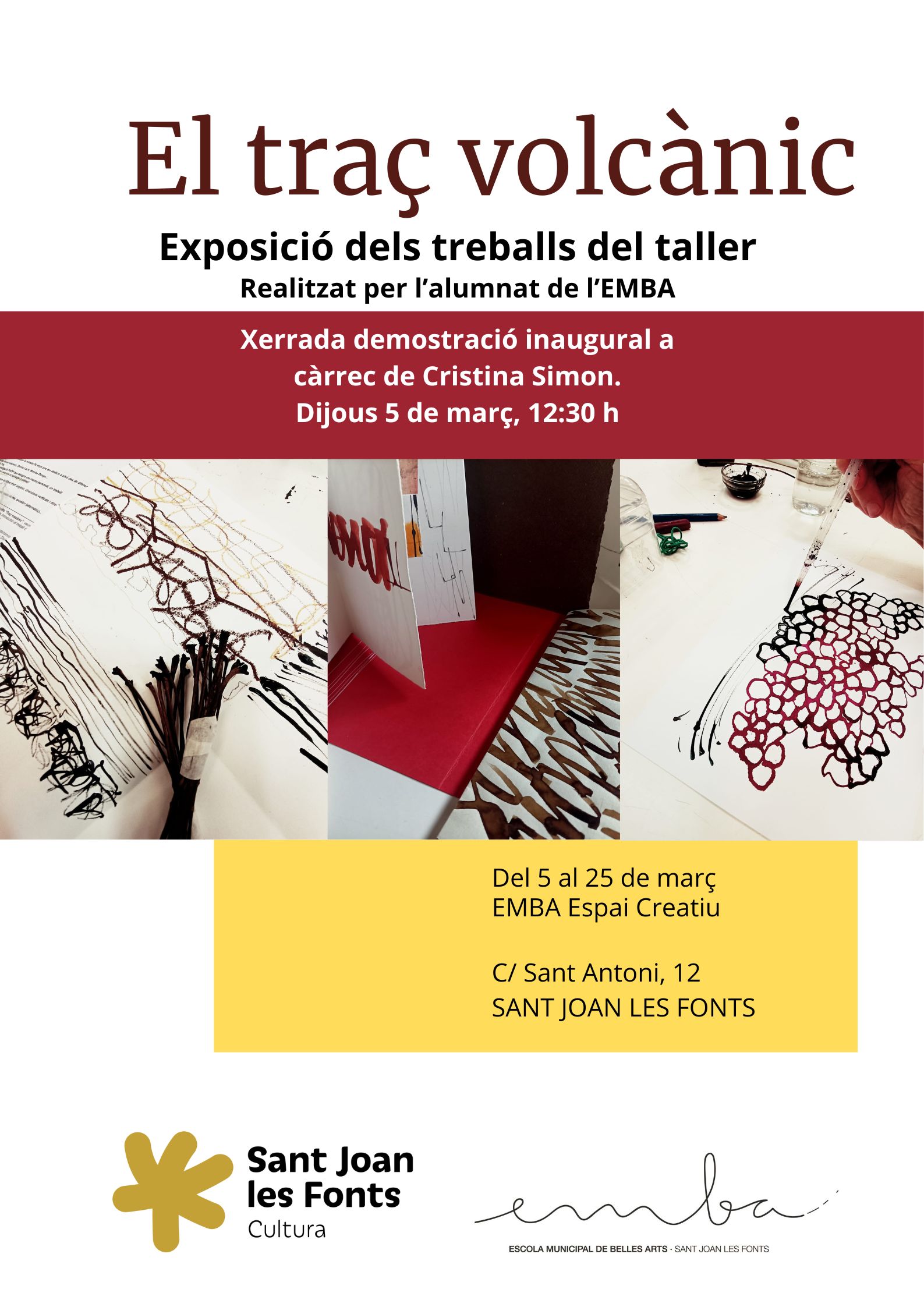Xerrada amb Cristina Simon, sobre el procés creatiu. L’acte obrirà la mostra dels treballs del monogràfic, inspirats en el traç. Dijous 5 de març de 2026 Escola Mpal. de Belles Arts (EMBA), 12:30 h Exposició fins el 25 de març 2026 (dimarts i dijous de 18 a 20 h. Dimecres de 10 a 12 hores)