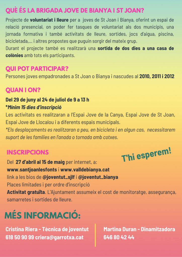 Projecte de voluntariat i lleure per a joves empadronats a St Joan o Bianya, nascuts al 2010, 2011 o 2012, oferint un espai de relació presencial, on poder fer tasques de voluntariat als dos municipis, una jornada formativa i també activitats de lleure, sortides, jocs d’aigua, piscina, bicicletada,… i altres propostes que puguin sorgir del mateix grup.