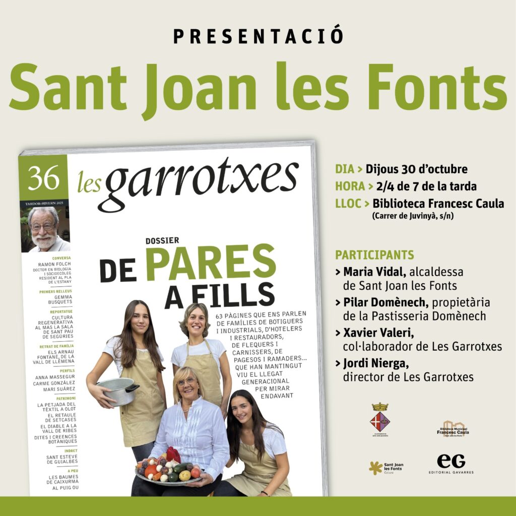 El número 36 de la revista Les Garrotxes” tracta la transmissió generacional de negocis de pares a fills.. L’acte, que comptarà amb la participació de l’alcaldessa, Maria Vidal, el col·laborador de la revista, Xavier Valeri, i el director de la publicació, Jordi Nierga, compta amb un article sobre Sant Joan: el que aglutina la història de la Pastisseria Domènech, que es va iniciar ara fa més de 80 anys amb Ferriol Domènech al capdavant. El seu fill Salvador, i la seva neta Pilar, n’han estat els continuadors. La Pilar també serà present a l’acte.