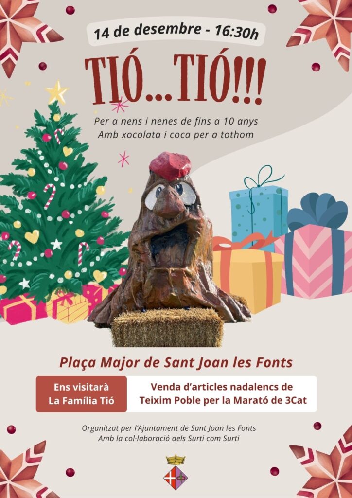 Com cada Nadal, el tió ens visita per assegurar-se que tots els nens i nenes de Sant Joan tinguin el seu regal. Ens visitarà la família Tió…i en Jaumet també! Hi haurà coca i xocolata per a tothom. Amb la col·laboració dels Surti com Surti
